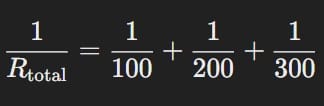 Tres resistencias están conectadas en paralelo: R1 = 100Ω, R2=200 Ω, y R3=300 Ω. Calcula la resistencia total del circuito.