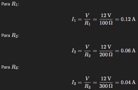 Donde I1, I2, I3, …, In son las corrientes a través de cada resistencia individual. La corriente en cada rama se puede calcular usando la Ley de Ohm: