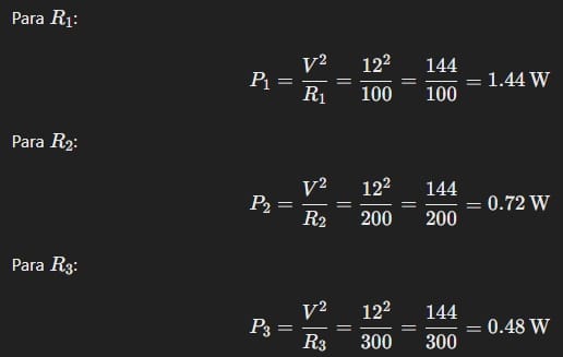 Usando los mismos valores de resistencias y voltaje del ejercicio anterior, calcula la potencia disipada en cada resistencia.